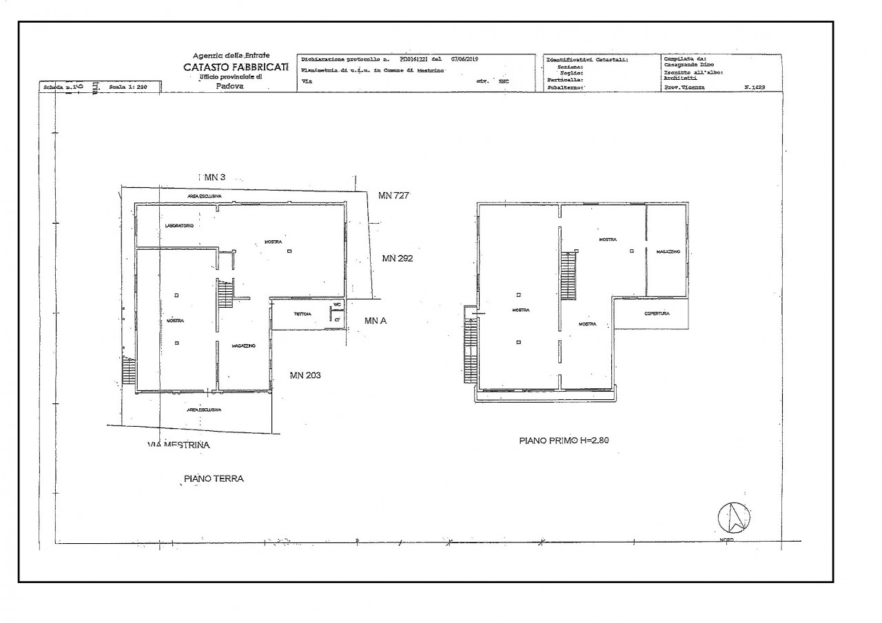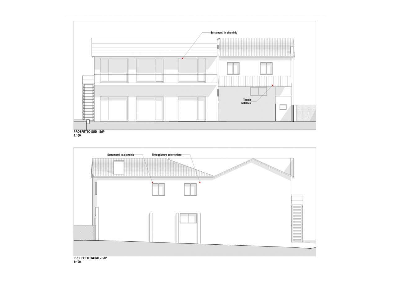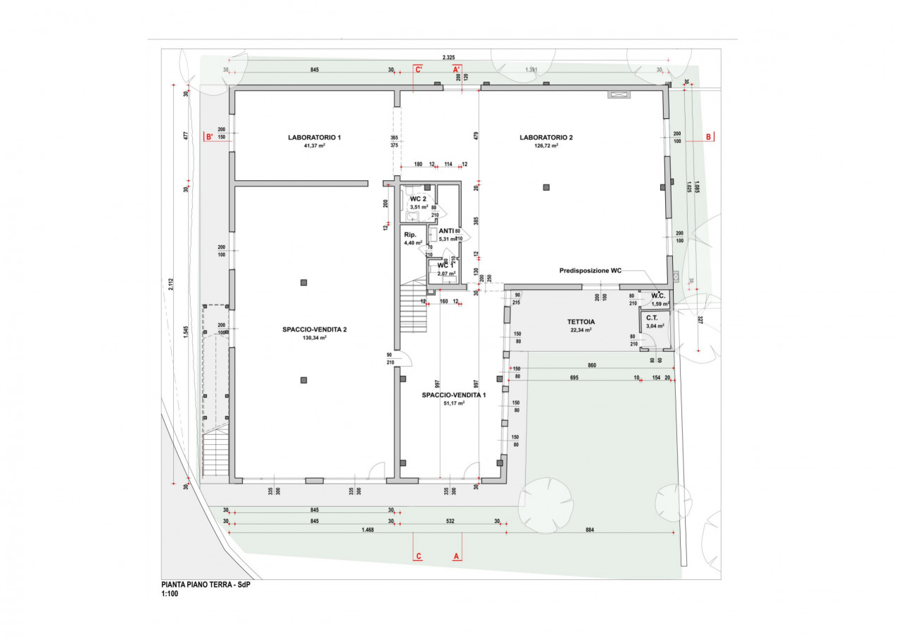 Piano terra: distribuito in 4 vani (2 laboratori, 2 spazi vendita) con doppi servizi e tettoia d’ingresso.