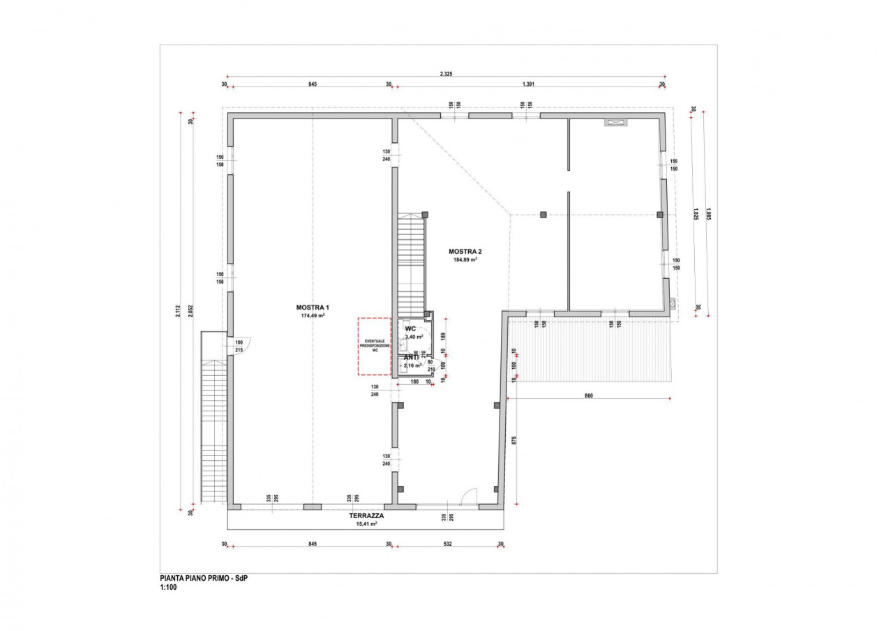 Piano primo: ampi vani open space per esposizione/magazzino con ulteriore bagno di servizio.